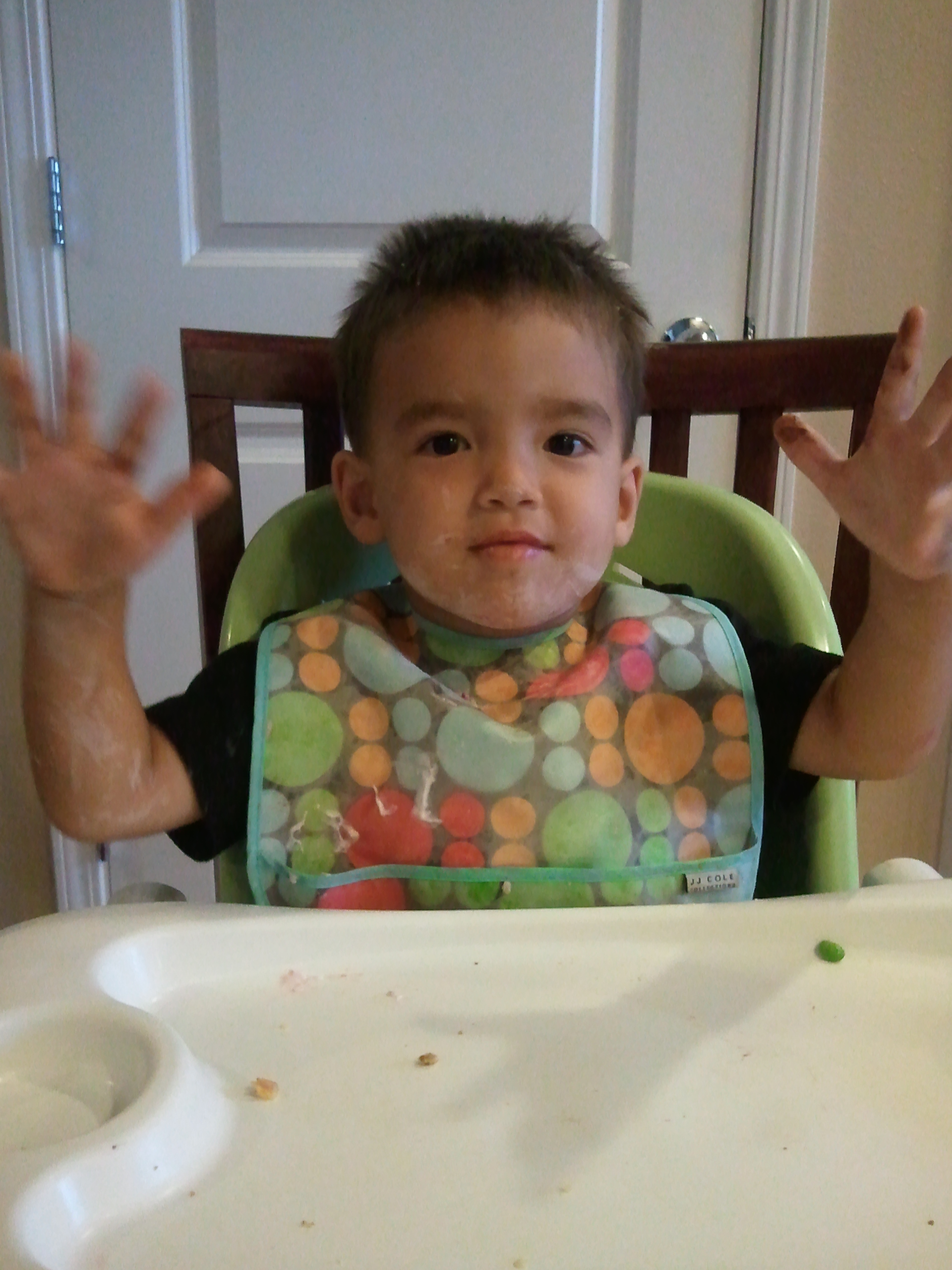 The kid is a dirt magnet. This photo doesn’t do it justice, but he has dried on yogurt all over both arms and in his hair (it’s his hair-product of choice, provides that spiky lift) and chocolate on his fingers…(Easter candy from his aunty) and every time he gets OUT of the chair, Lucy isn’t far behind because whatever he was eating (today was edamame and macaroni and cheese) falls off his butt…