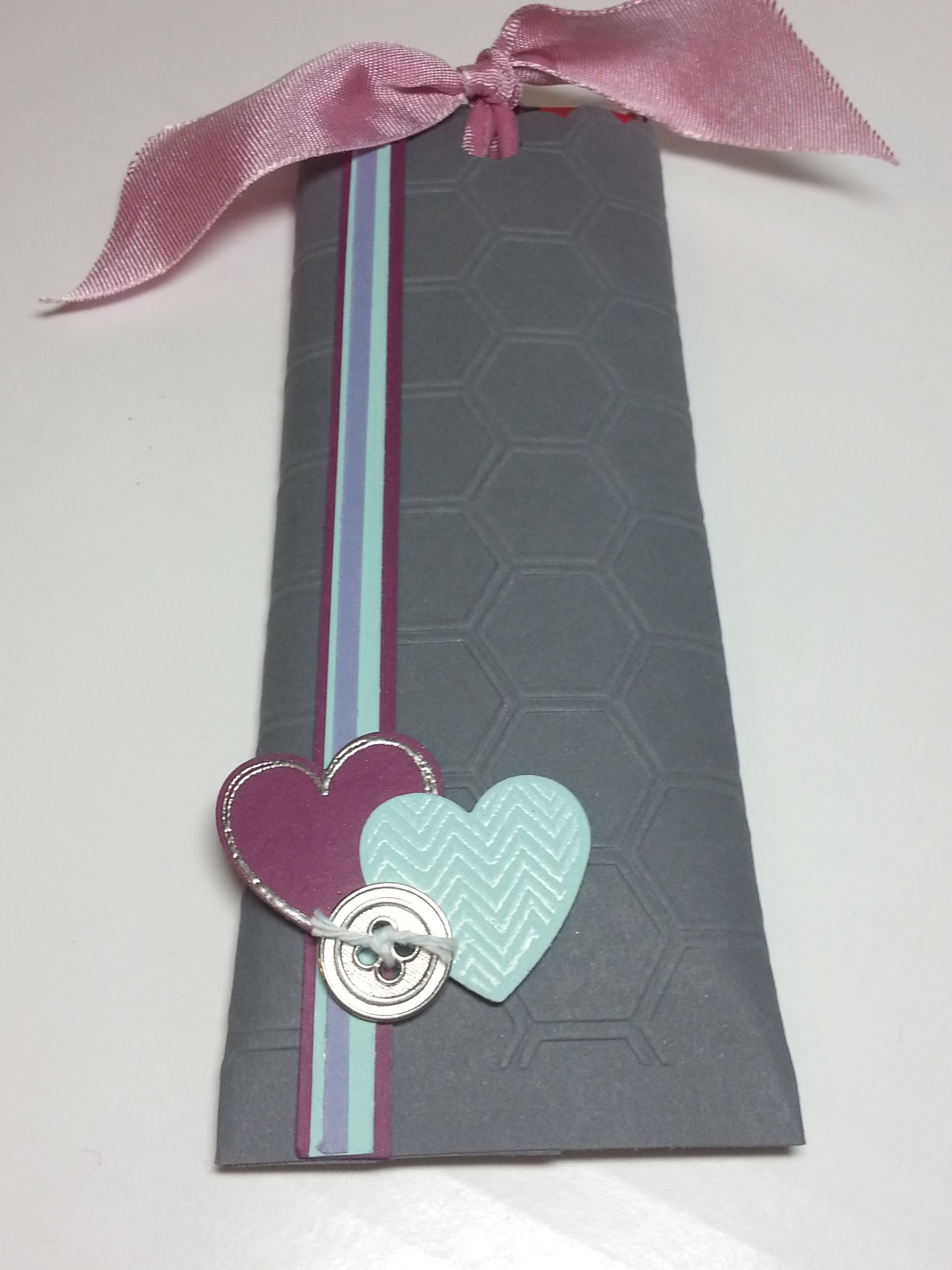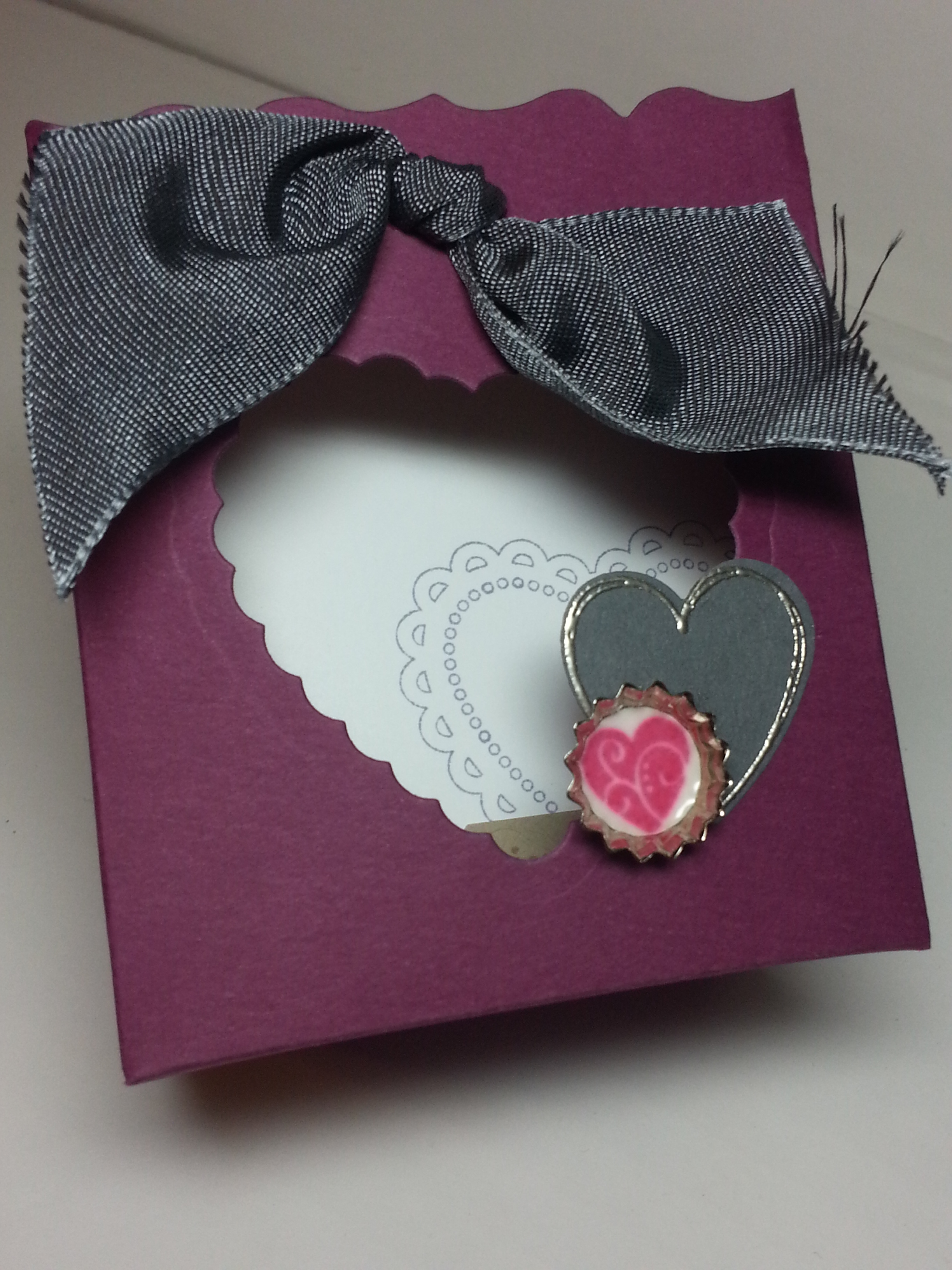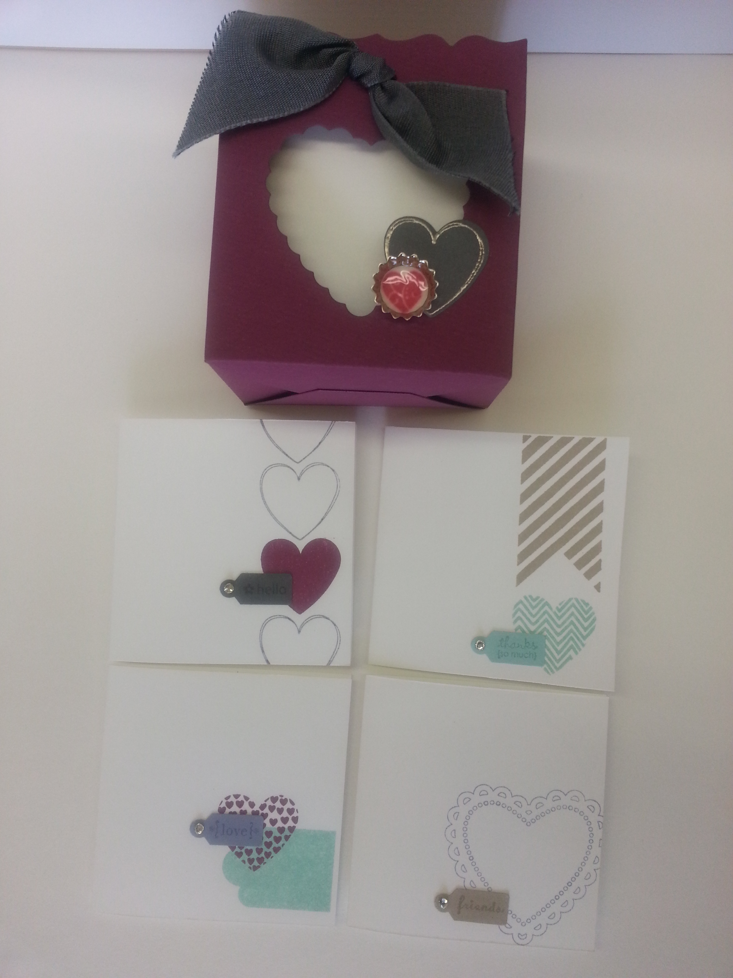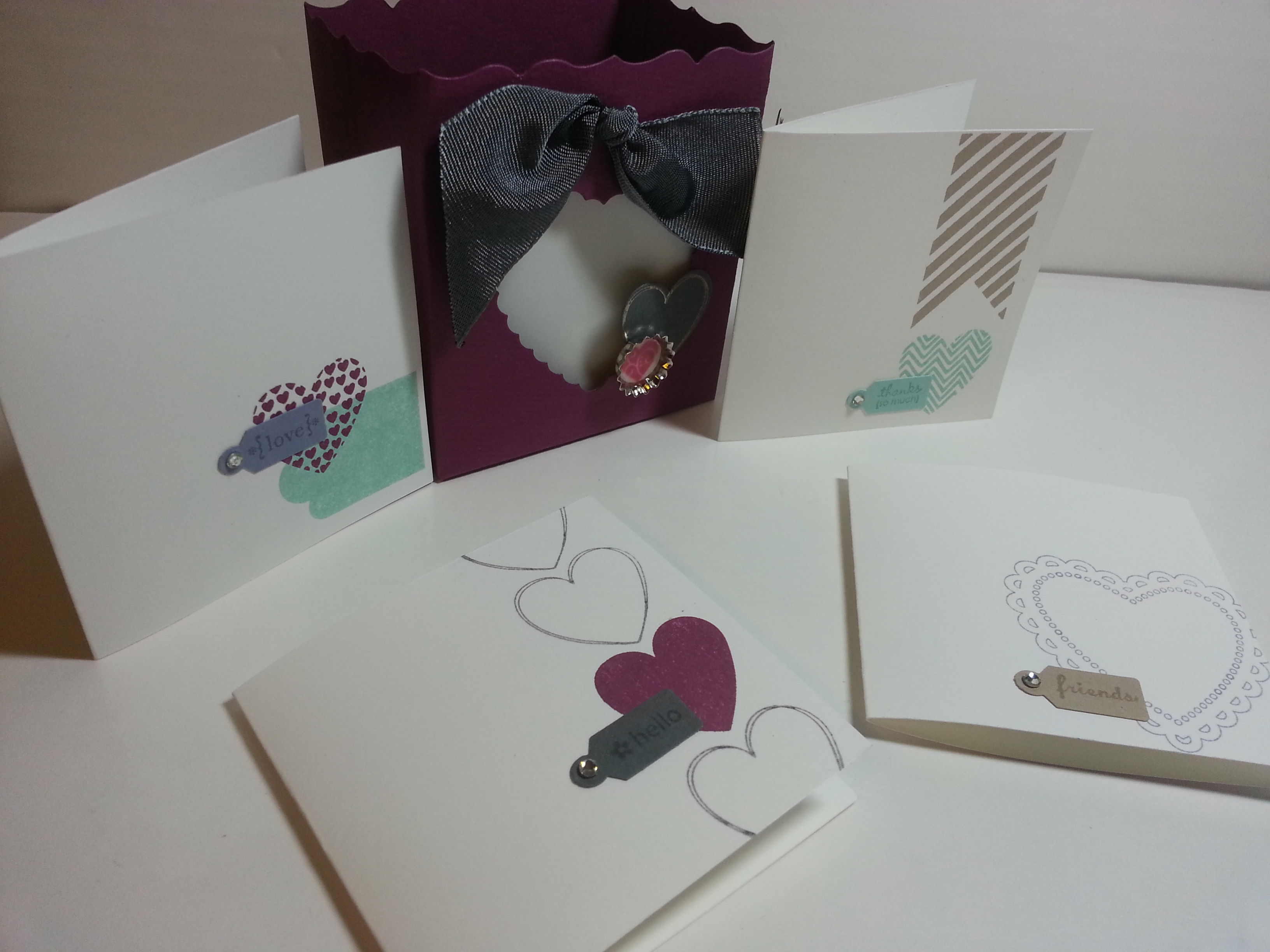 Needed a little of inspiration, I took to pinterest to find a color challenge. This one was a fun one… Rich Razzleberry, Pool Party, Basic Gray, Wisteria Wonder, Whisper White. I gotta say, Pinterest is the creative jump-start… And here is what I came up with. I kind of wanted to do a SUITE of different things… for all the different people you need a little gifty for on Valentine’s Day.