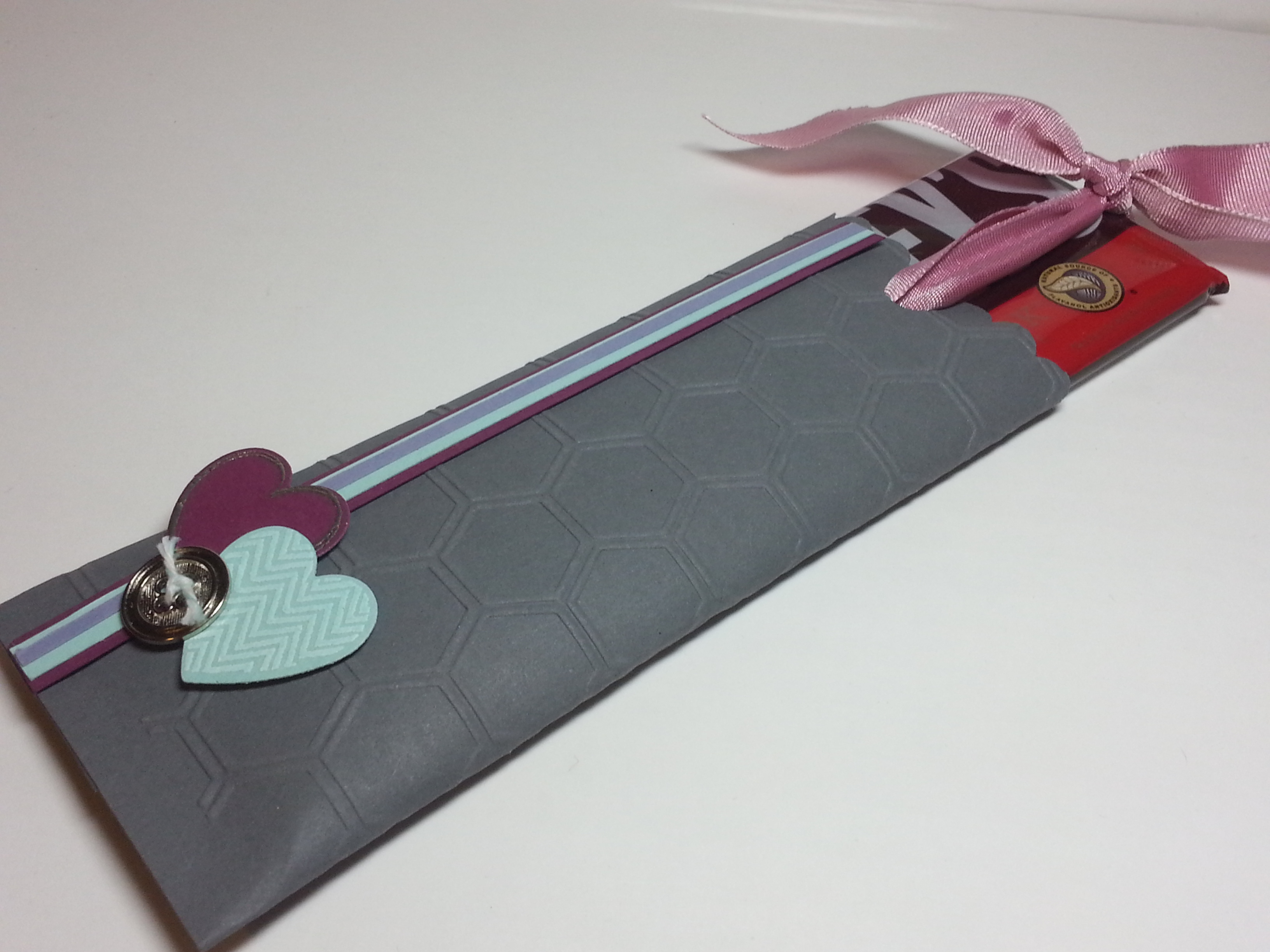 And here is the package without the chocolate, so you can see how to put it together. Punch a hole in the TOP LAYER ONLY of your pocket (and to make the pocket, I just cut card stock a little longer and wider for it to wrap completely around a chocolate bar…or WHATEVER… but this teacher likes chocolate… dark chocolate). Thread ribbon through it and around a chocolate bar, and tie. There… It will slide in and out… And BTW… I lied again. The Two Toned Ribbon may be my favorite item. Well… I CAN’T DECIDE ON A FAVORITE.