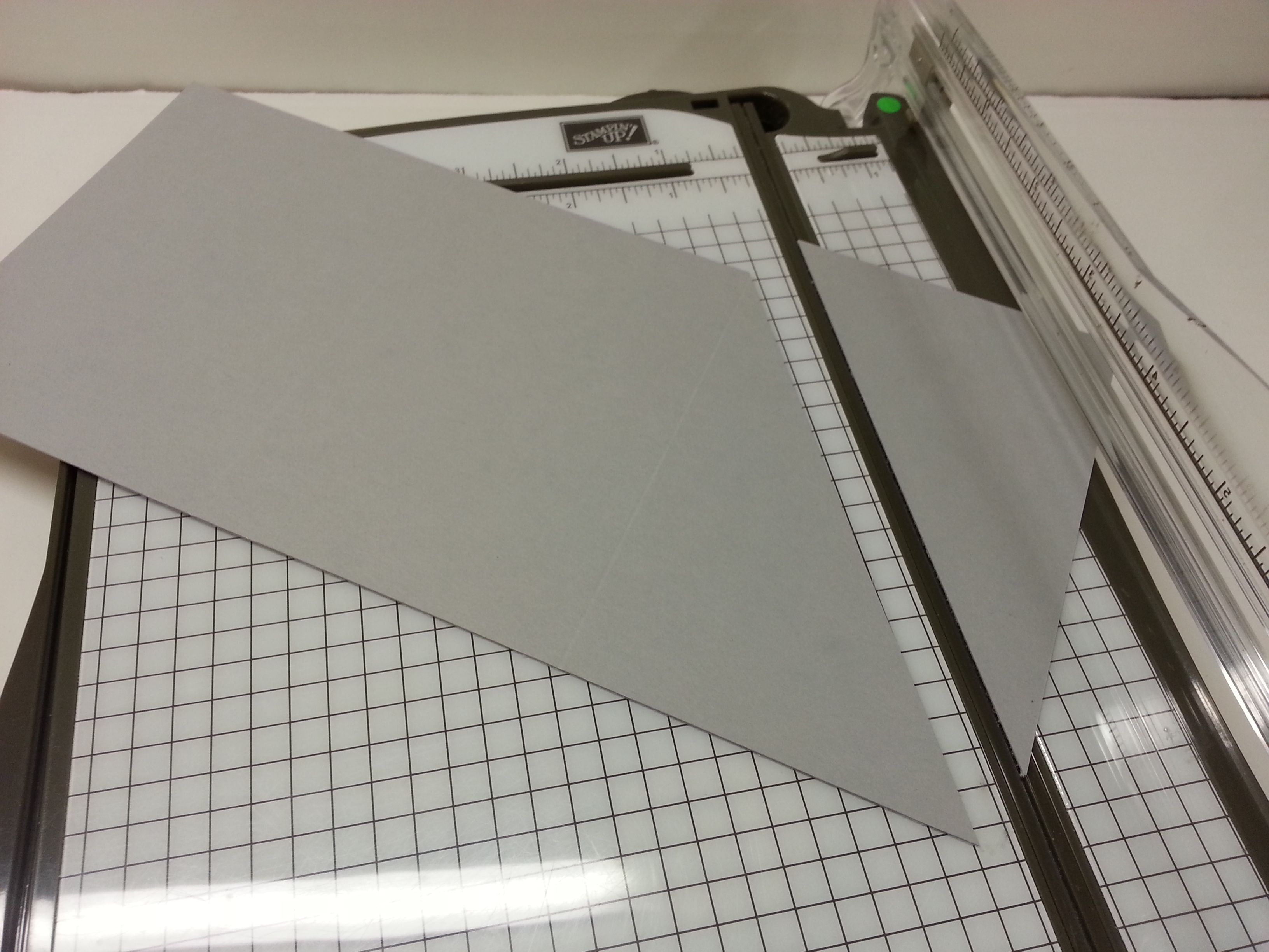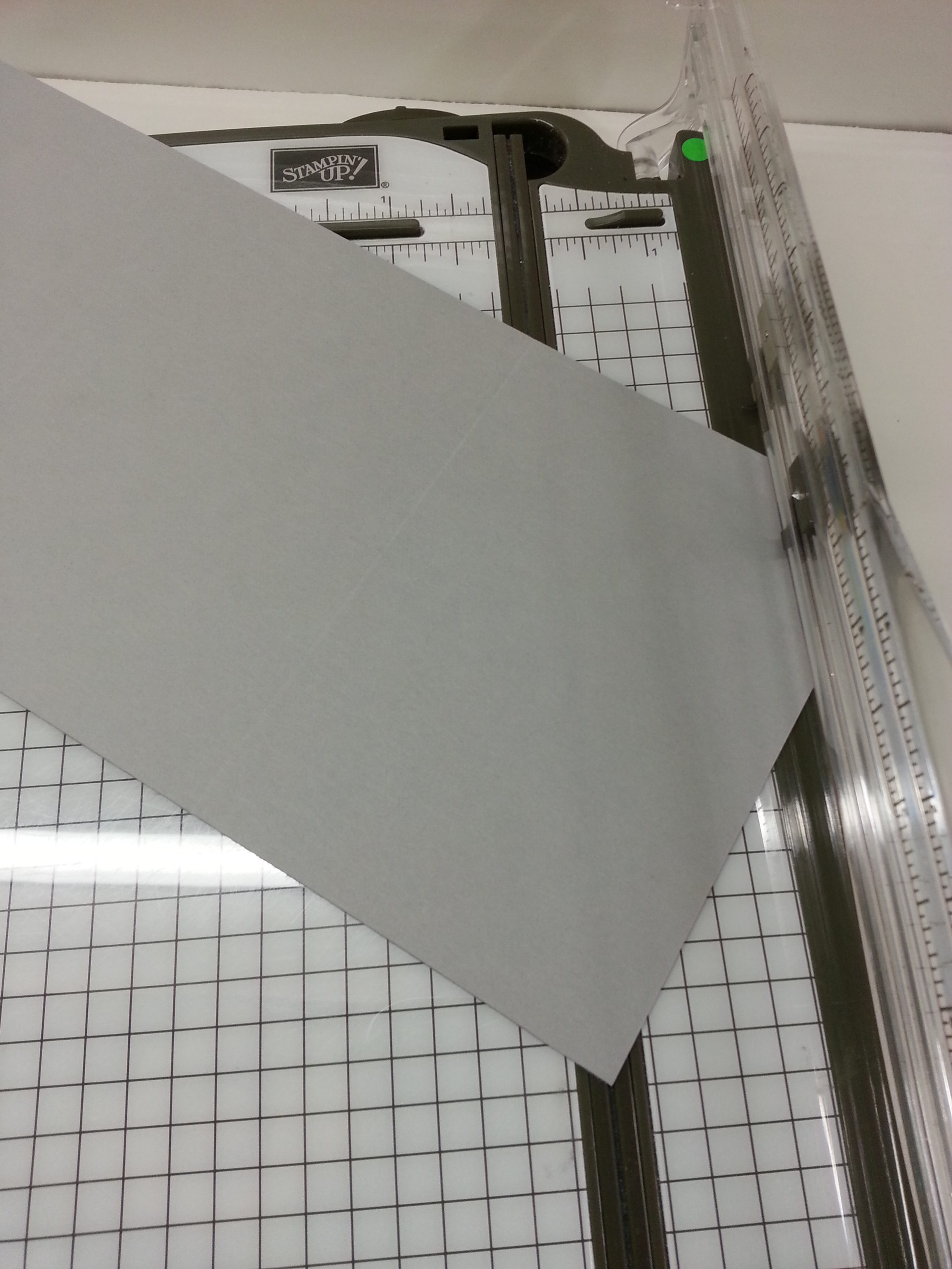 Here is how to cut…  Line a score mark up on the top part of the cutting surface of  your trimmer and the corner of the paper on the bottom of the cutting surface of your trimmer.