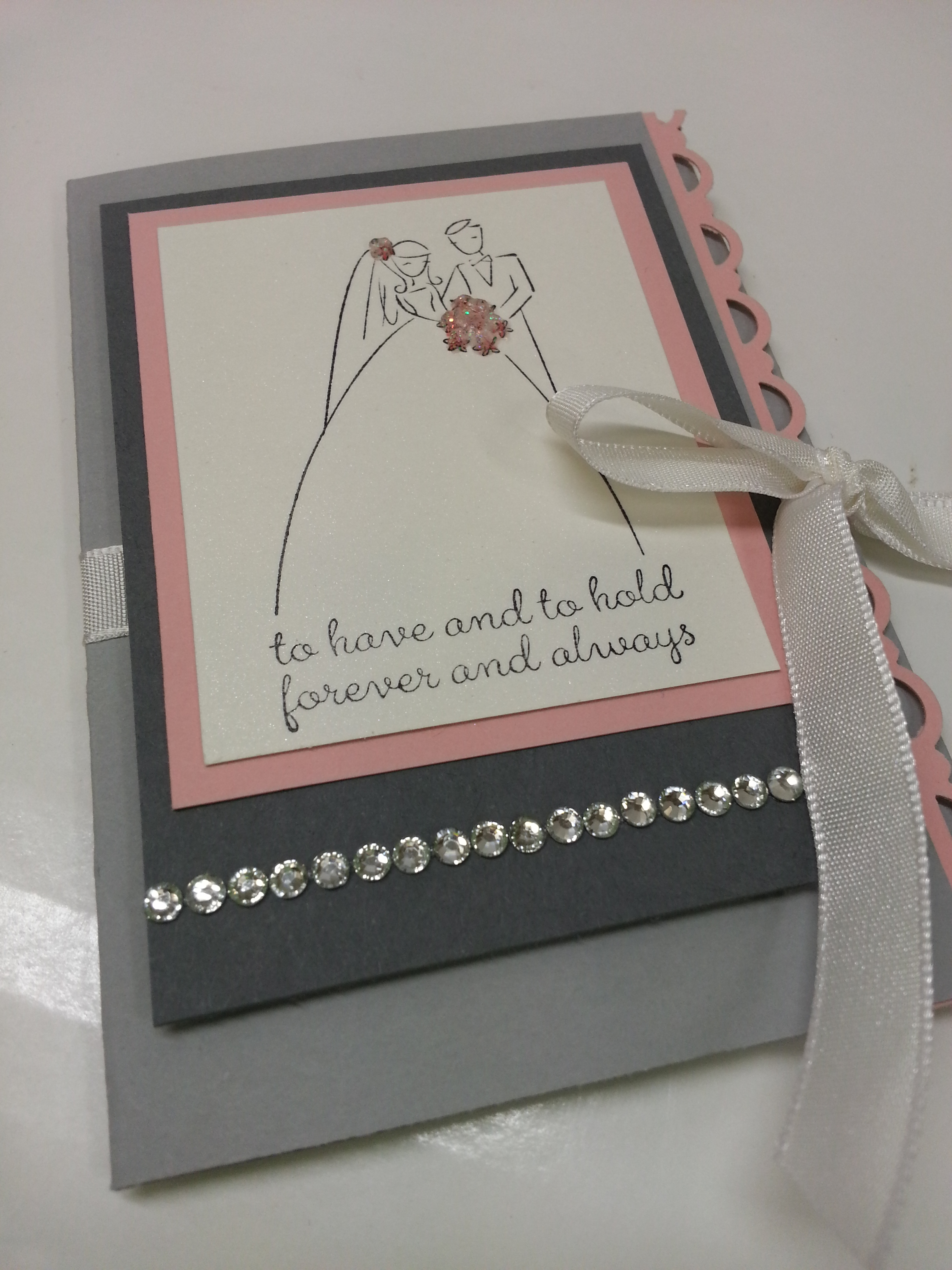 So, the colors I used in this were the Smokey Slate (It’s a new one and I absolutely Love it), Basic Gray, and Blushing Bride (hee hee….get it… BRIDE???).  I used the white taffeta ribbon and a squish of the dazzling details glitter paint.  And, I thought this would be the perfect place to use one of those ROWS of the rhinestones.  Cause what do you do with those??  I always use my whole sheet up and have those 3 strips left.  I then wind up cutting them apart and using them all as singles.  I can’t remember EVER using a whole strip.  But, I did.  This time…