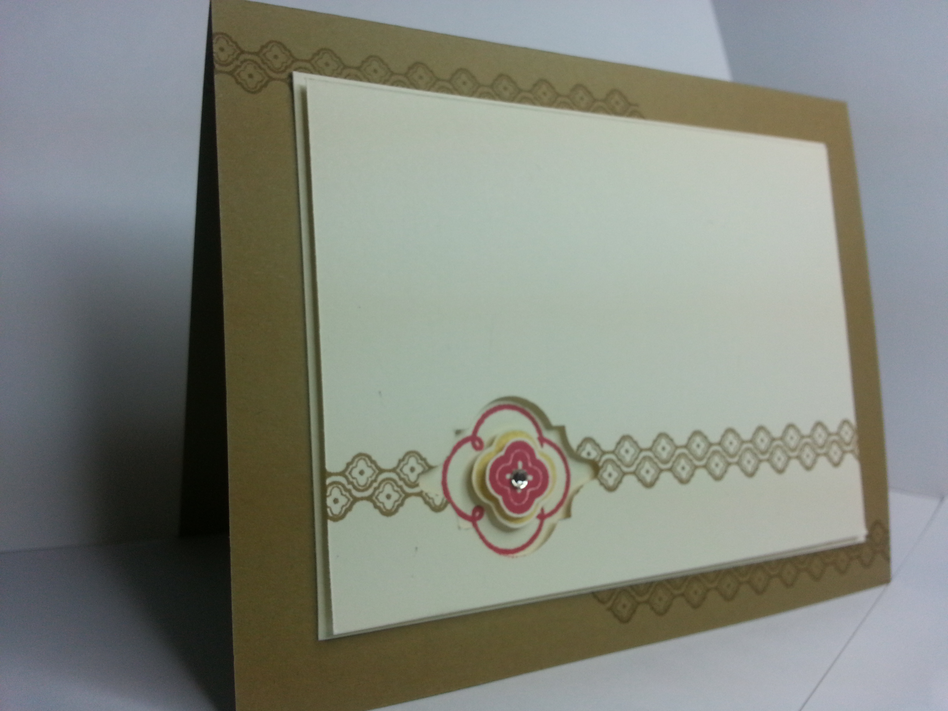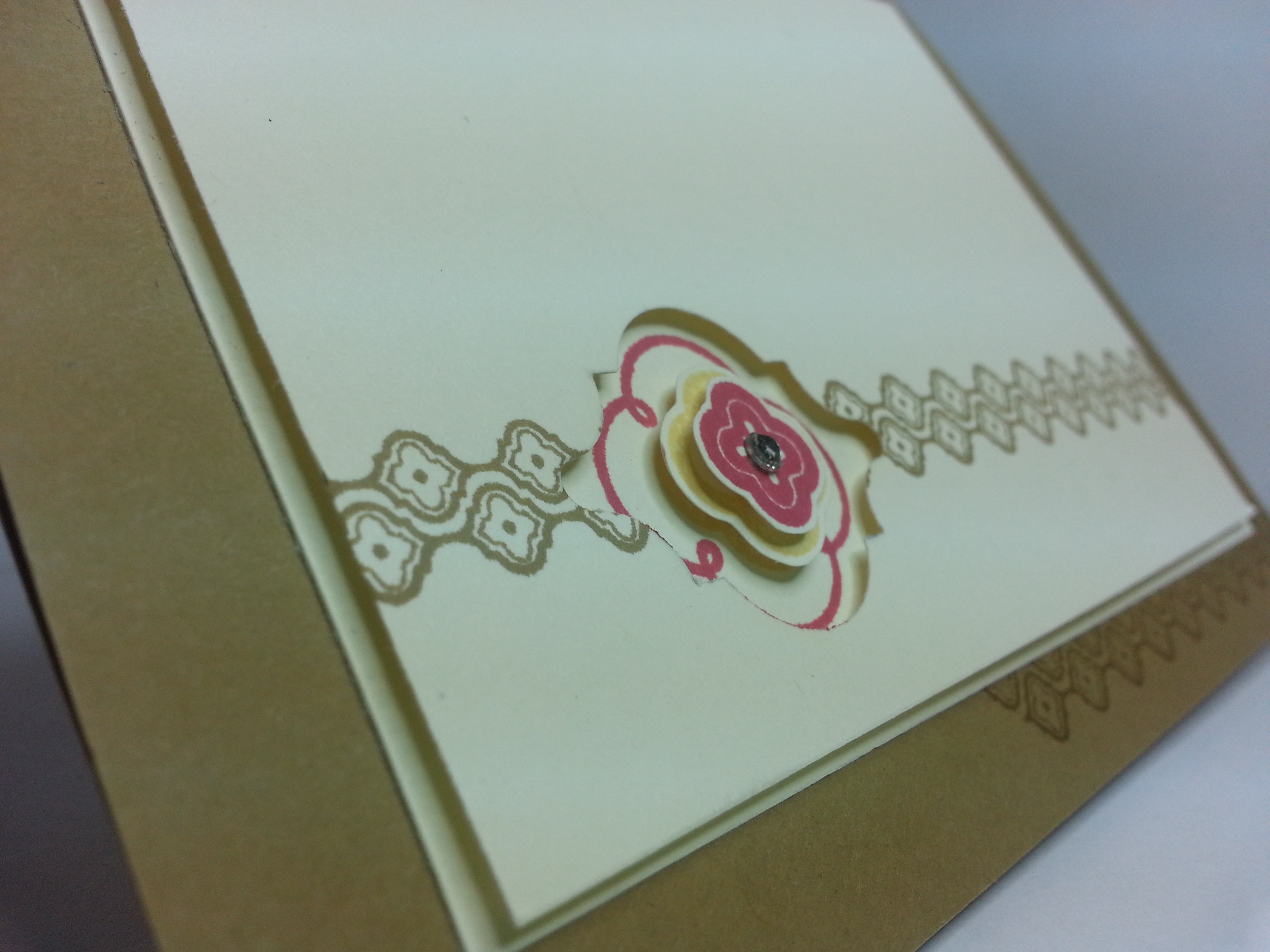 Here’s a closer look at the detail.  The top vanilla panel was cut 1/8″ shorter in each direction just to give a small frame.  I stamped and punched the top panel. I stamped the strawberry slush stamp THROUGH the punched out hole.  Then added the two small stamps with dimensional.   And, of course, a diamond. I added several dimensionals on the back of the top panel just so it would create a space for the cut-out section to stand out.