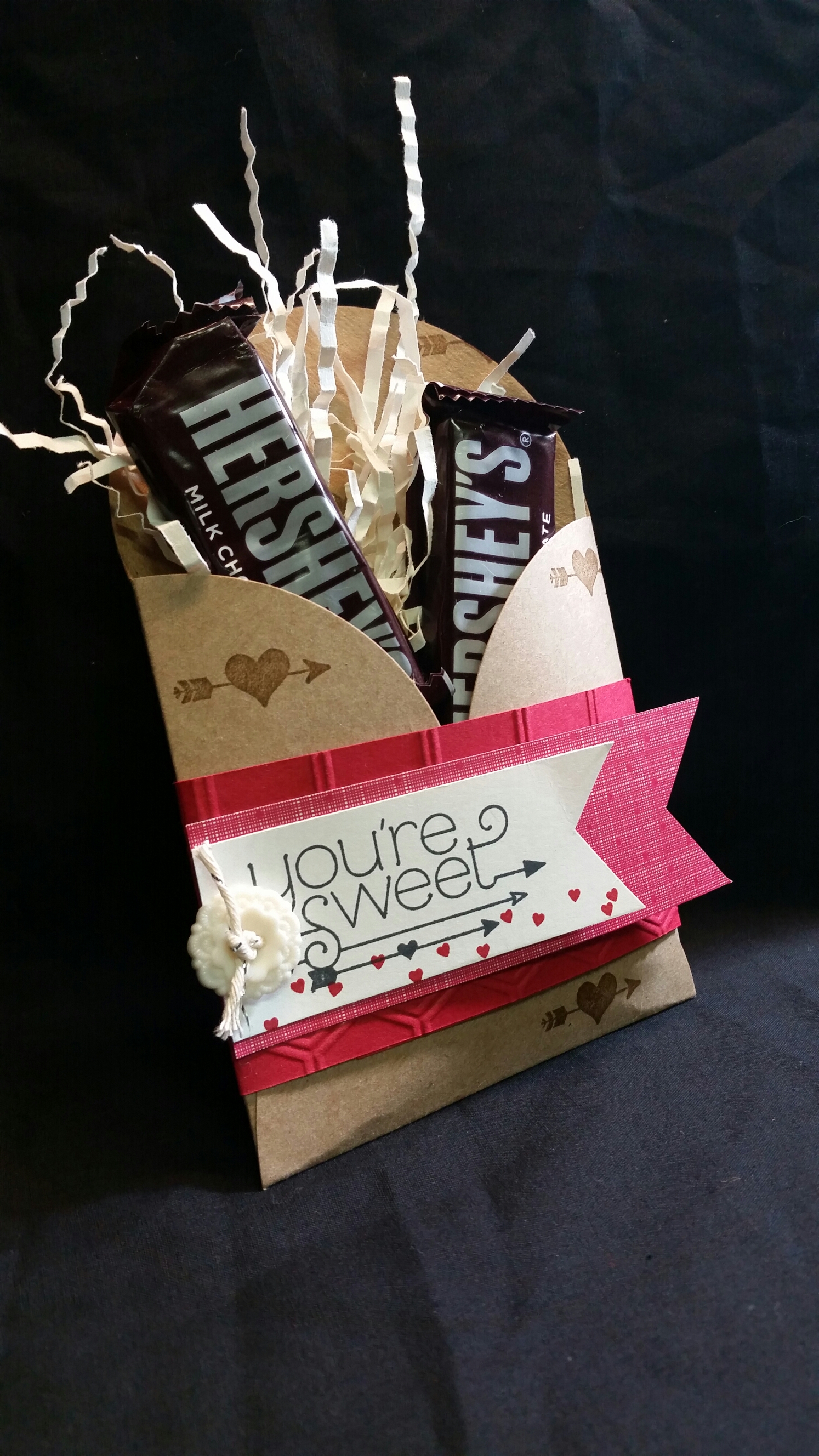 This one is a little treat holder I made with the gift card enclosures. Super fun… SUPER fast!! You can make up a pile of these in no time and pass out to friends and co-workers for Valentine’s!!