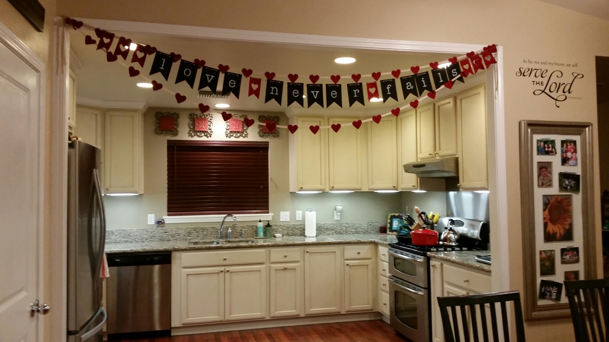 The next project I made was this Valentine’s Banner. I decided to use the “Love Never Fails” phrase from I Cor. 13… Just cause I thought it would be something different to hang up, but still Valentiney… I used the chalk board banner kit…WHICH I LOVE. Everything is pre-made and ready to go… I had the stencils left over from the canvas banner kit so I used those to make the letters….And, I made the letters with the white chalk marker rather than chalk. That way, it was more vibrant.