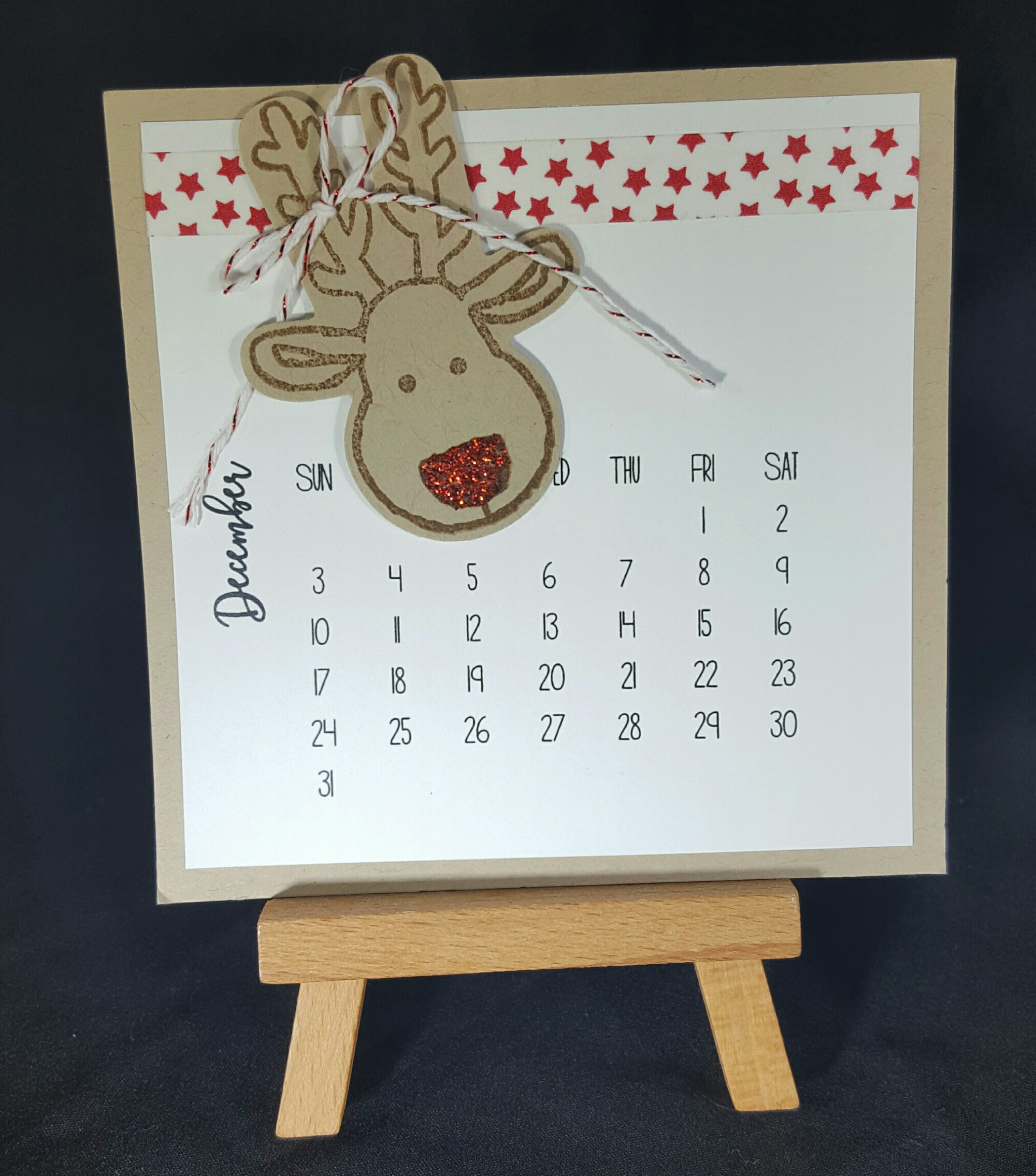 This calendar was SO simple… stamp Rudy in soft suede on crumb cake paper, punch. Glue. Some washi tape background and a little red dazzling details paint. AND DONE. If only the rest of Christmas were that simple…. 🙂