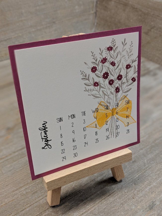 Anyway, to help WELCOME fall I have this month’s calendar. The stamp set is Wishing You Well from the fall and winter catalog from LAST year (so now retired). But I really liked it’s simplicity and ‘fallness’.