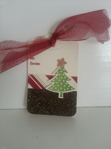 See the red seam binding? It’s cleverly disguising a red spot on the image, where I dropped the stamp into the red stamp pad after having the espresso ink on it already. (BTW: the red is Cherry Cobbler). And, I like the cherry cobbler seam binding on the card. Don’t you just love happy accidents? Anyway, back to embossing…. stamp the image in versamark, cleverly apply the ink from the other stamp pads, then sprinkle with clear embossing powder and emboss. I decided to hand trim the image out because I wanted to be able to layer it onto the espresso tag that I made with the coordinating framelit… so, yes, I cut it by hand…