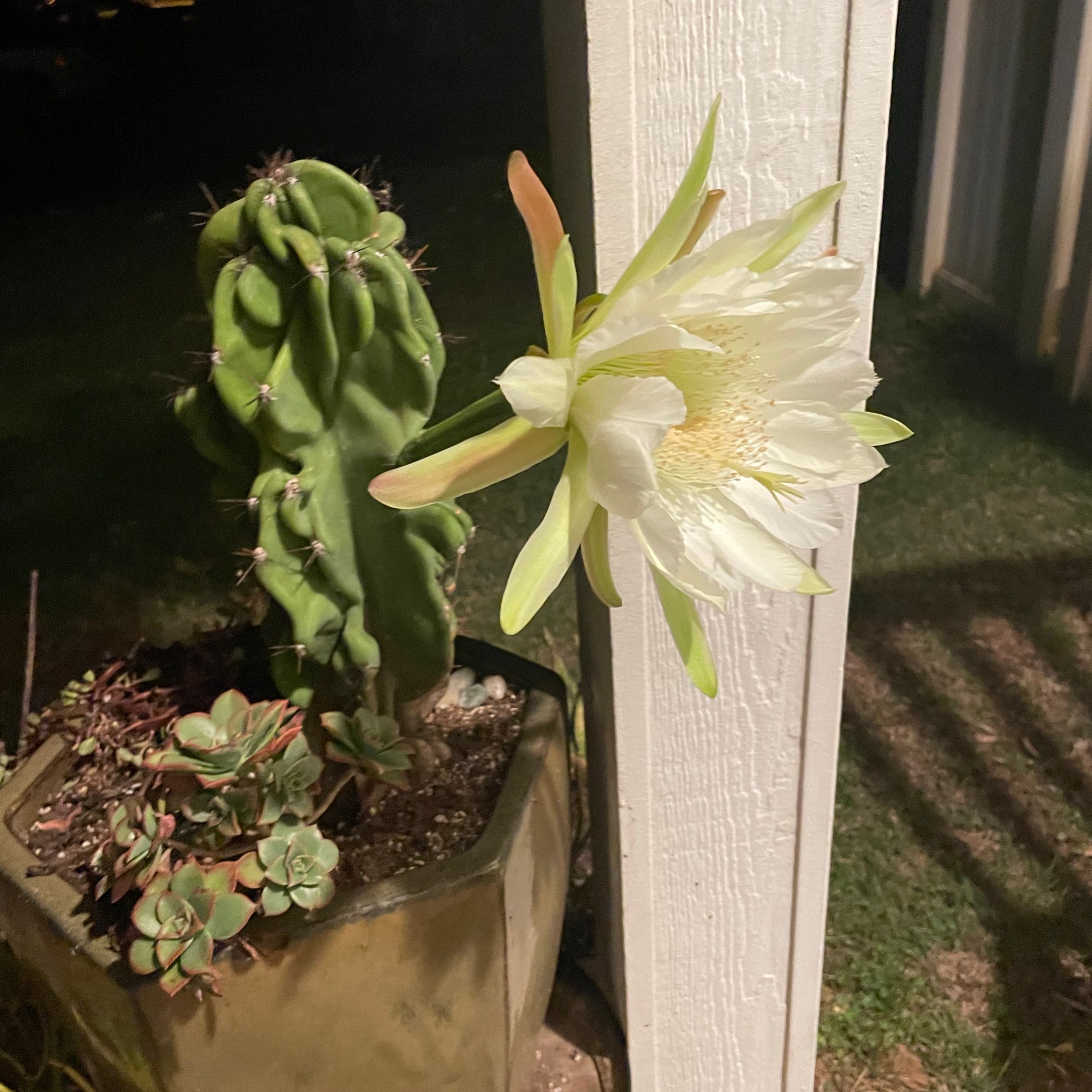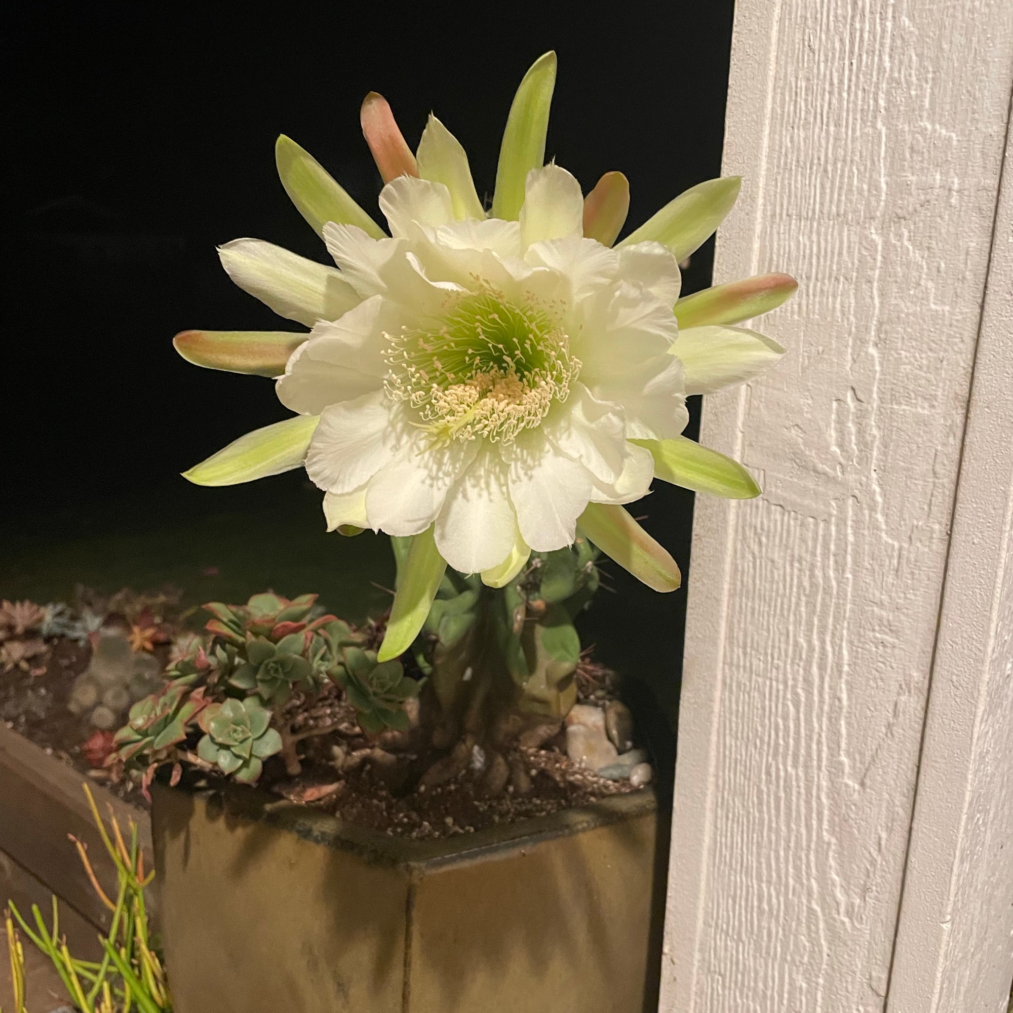 WELL. A couple weeks ago, one of my cactuses (and I’m not sure what it is– but it’s a pretty tall one) sprouted a bud. That kept growing. and growing. And, every night and every morning I would go check to see if it opened… and kept waiting and waiting…. UNTIL: