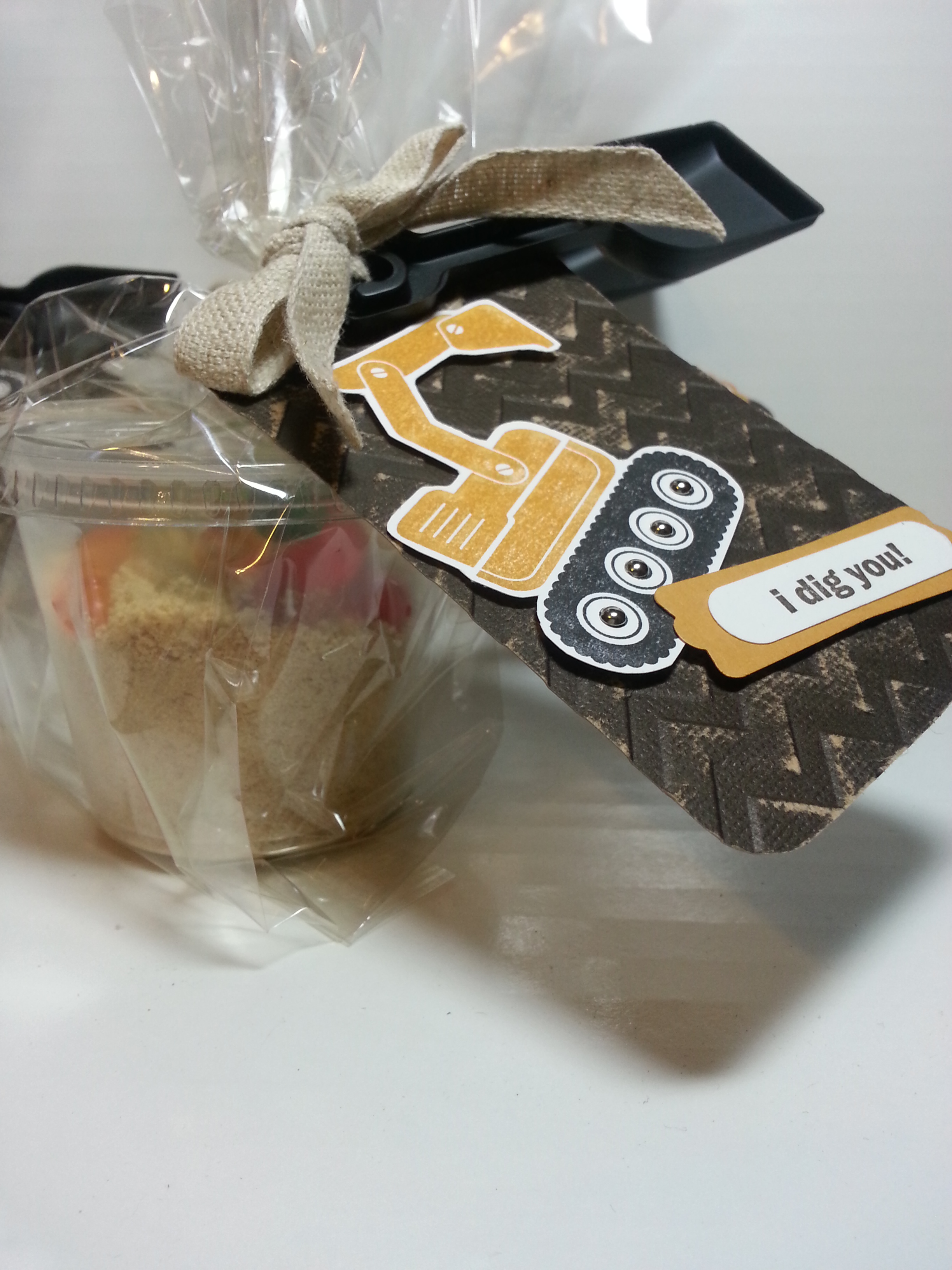 This comes from the I DIG YOU stamp set. I markered them, stamped, and cut out. Used the tiny brads to put on the wheels and then put them on the large tag from the two tags die. This was cut from the early espresso core’dinations paper, embossed and sanded (sorry… paper isn’t available anymore. email SU… to tell them they need to re-release it.) I found these tiny shovels on amazon to add to the tag. (Isaac LOVES shovels).