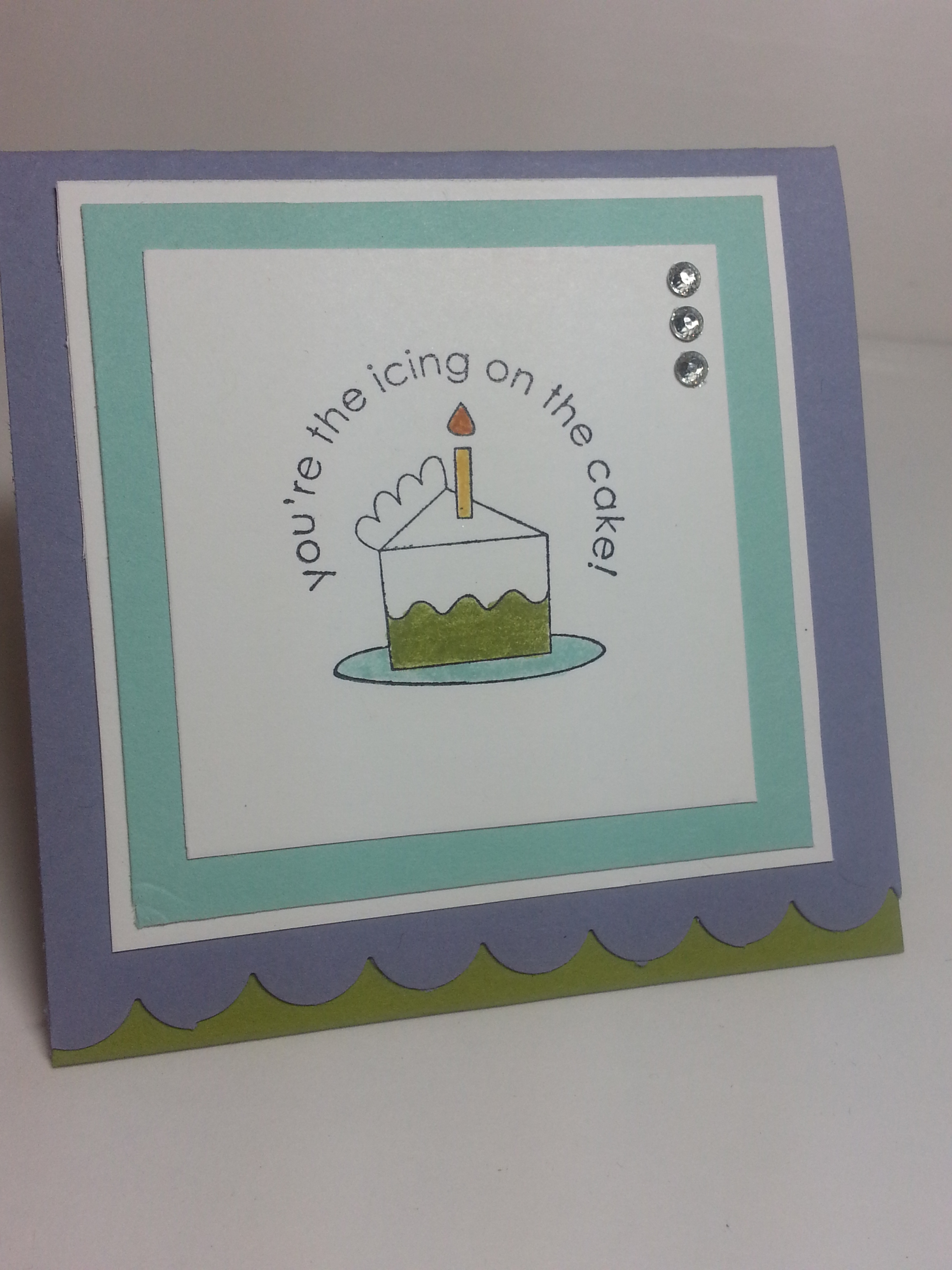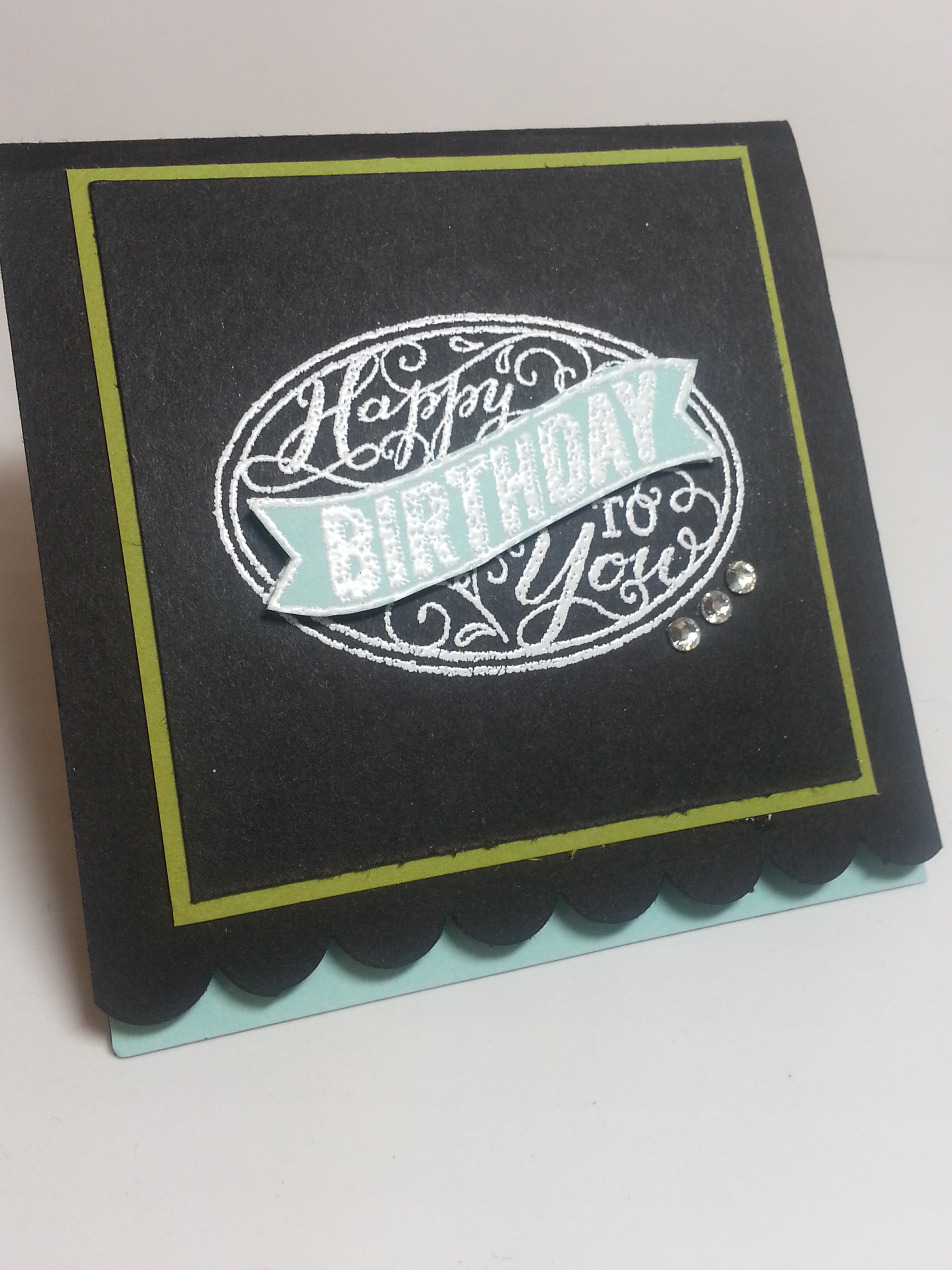 For this set, I looked on Pinterest (my favorite place for wasting time) to find a color challenge. This is a good way to jump start a creative process. I chose one that was Wisteria Wonder, Whisper White, Basic Black, Lucky Limeade and Pool Party. These cards are basically made all the same way… 3×3… I used the scallop border punch to punch the bottom… and in doing so, I put a different color to be the inside of the card just so it would show up under the scallop border.